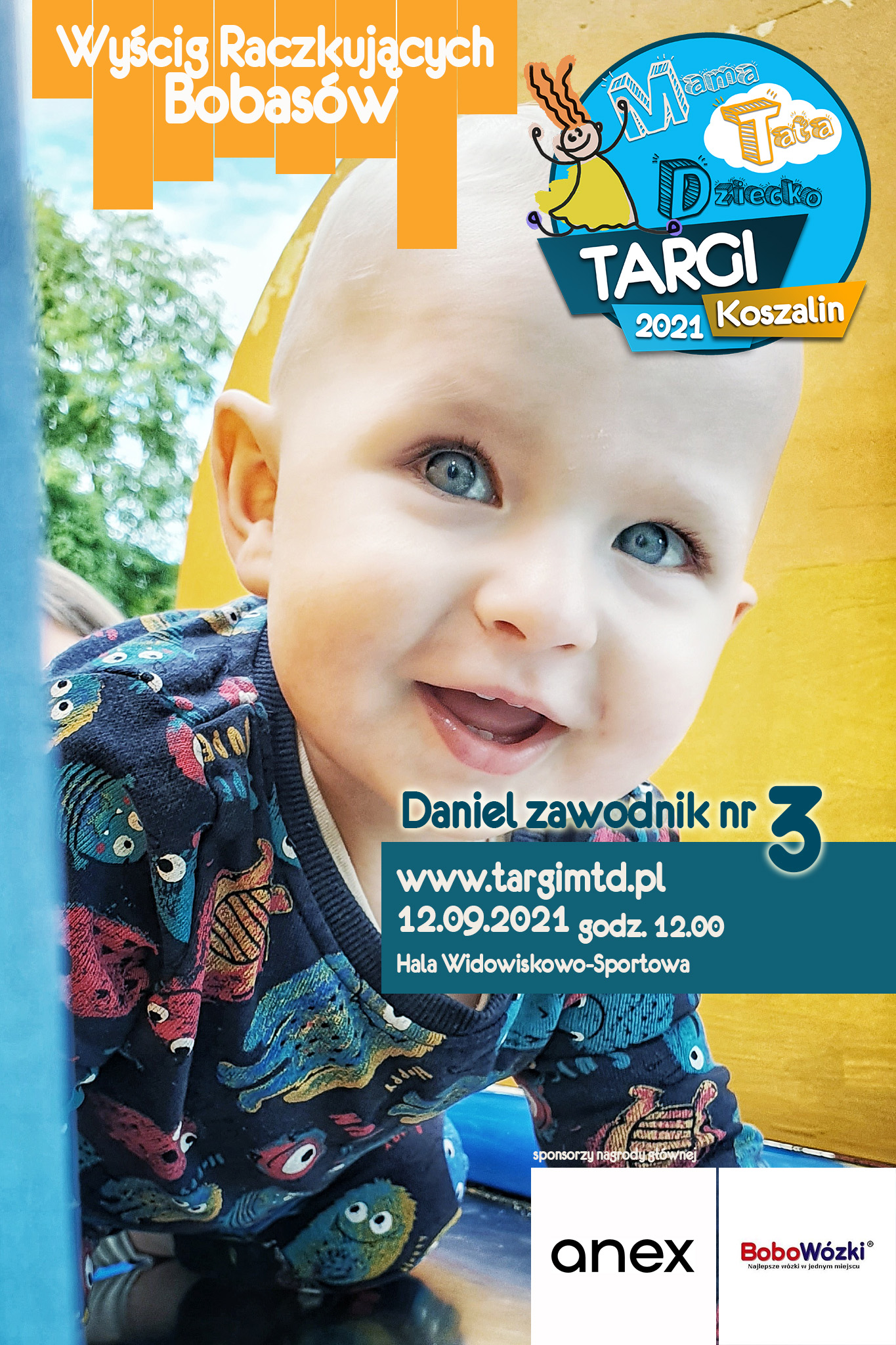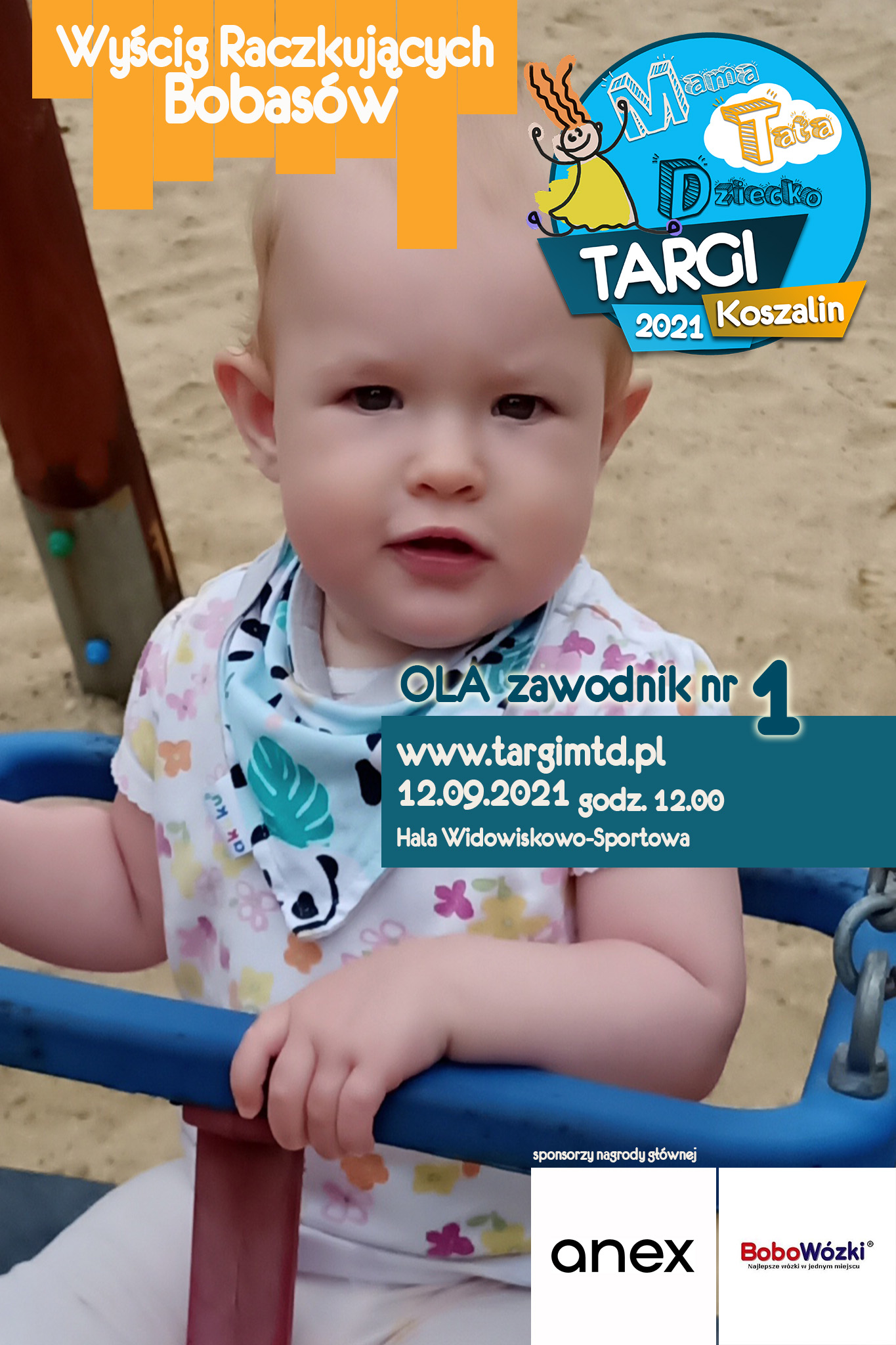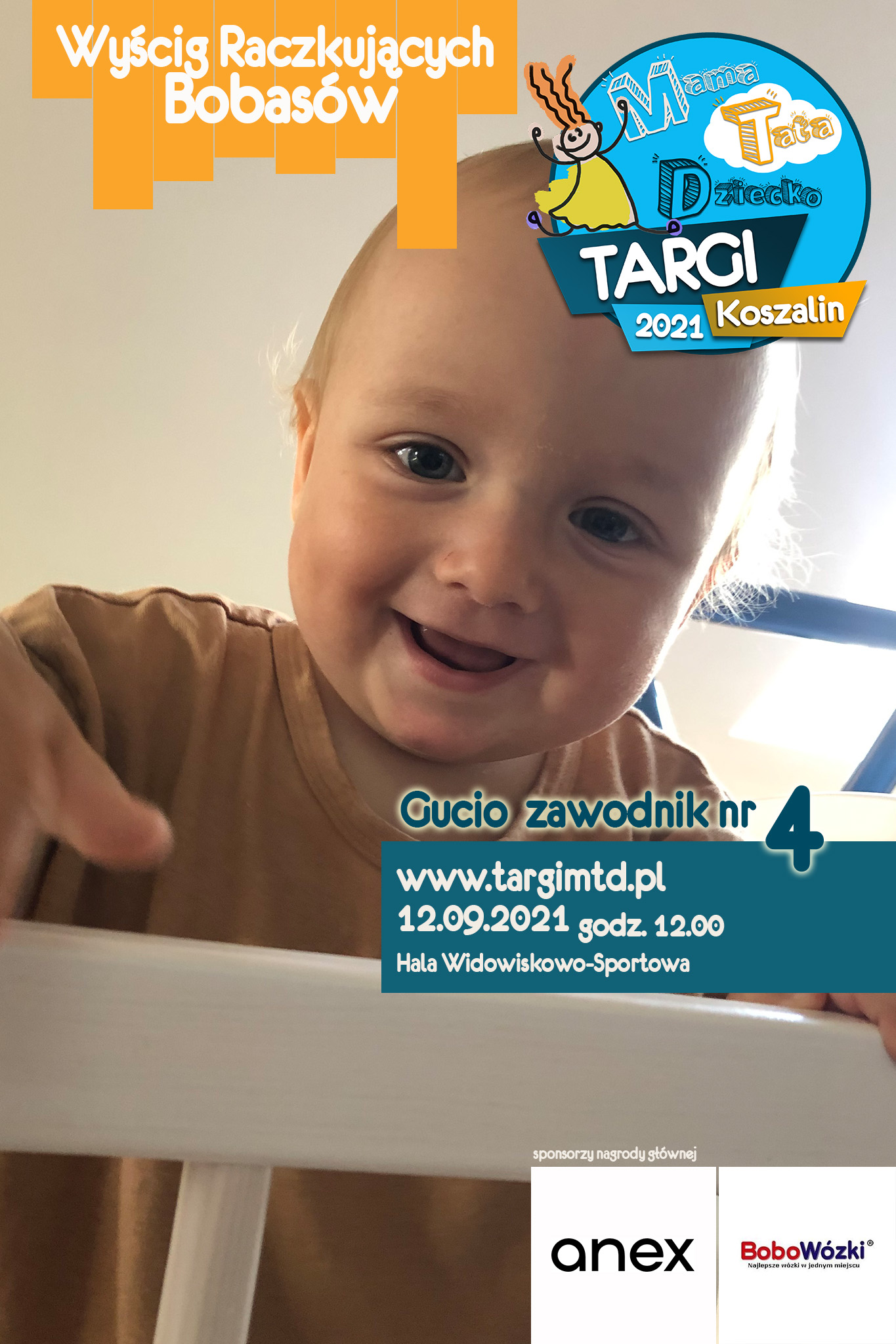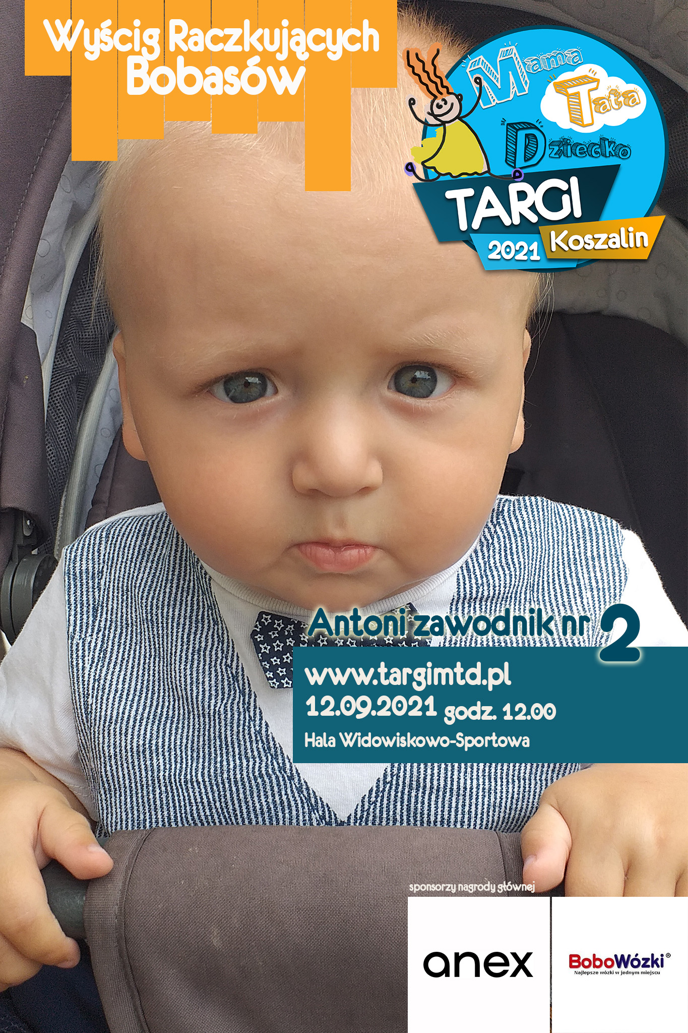 To już 3 edycja imprezy imprezy towarzyszącej, która okazała się strzałem w 10. Kilkunastu małych zawodników i zabawna „rywalizacja” na najwyższym światowym poziomie 🙂 Jeśli twój bobas jeszcze we wrześniu będzie raczkował to nie zwlekaj i zgłoś go do zabawy (edit: lista uczestników już zamknięta). Do wygrania atrakcyjne nagrody od naszych sponsorów. W tym roku jest to wysokiej klasy spacerówka firmy ANEX BABY o wartości 1599 zł od sklepu BOBOWÓZKI Koszalin. O szczegóły prosimy pytać mailowo targi123expo@gmail.com