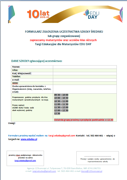 Prosimy pobrać formularz w postaci jpg lub pdf. Pobierz tu: Formularz zgłoszeniowy dla szkół oraz grup zorganizowanych odwiedzających Targi Edu Day