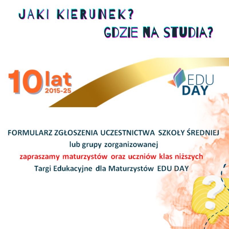 Prosimy pobrać formularz w postaci jpg lub pdf. Pobierz tu: Formularz zgłoszeniowy dla szkół oraz grup zorganizowanych odwiedzających Targi Edu Day Targi są przede wszystkim dobrą okazją dla uczniów szkół średnich do zapoznania się z ofertą kształcenia na Uczelniach Wyższych. Ostatni gwizdek przed Maturą na to, aby zdecydować jaki kierunek kształcenia wybrać! Jeśli nie możesz […]
